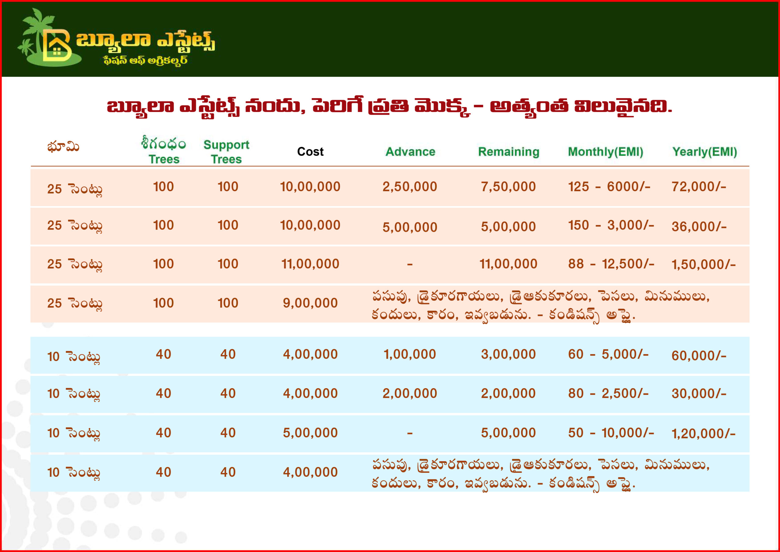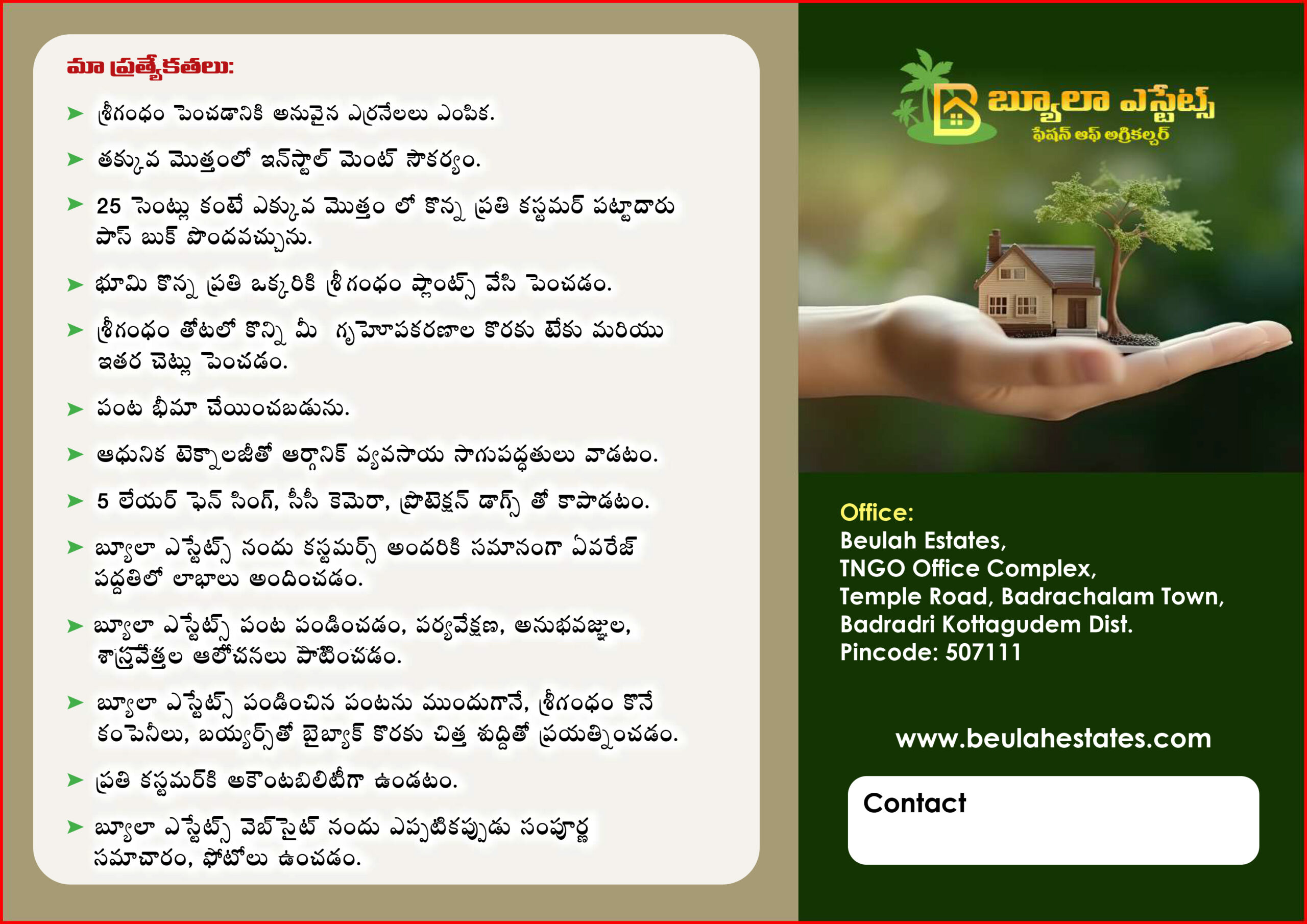 At Beulah Estates, we go beyond just selling land—we create lasting value. Specializing in premium land sales combined with sustainable sandalwood cultivation, we offer investors and landowners a unique opportunity to own appreciating assets with long-term growth potential.